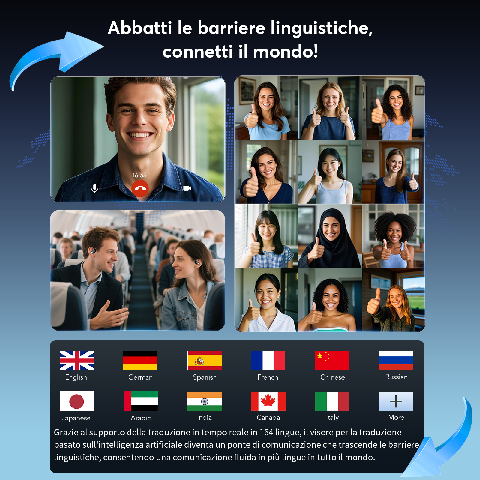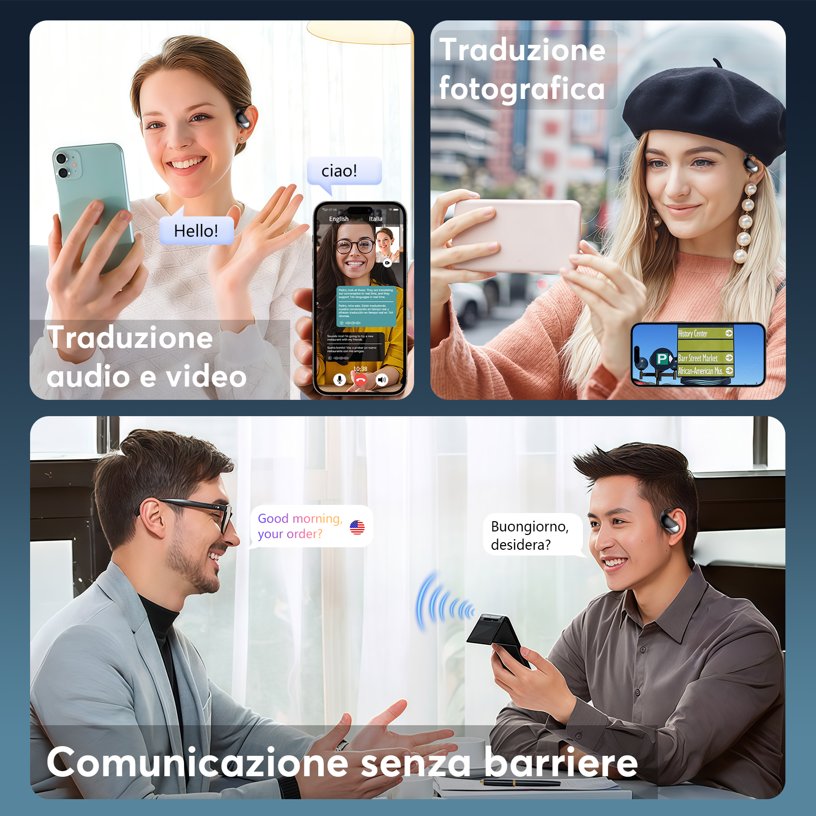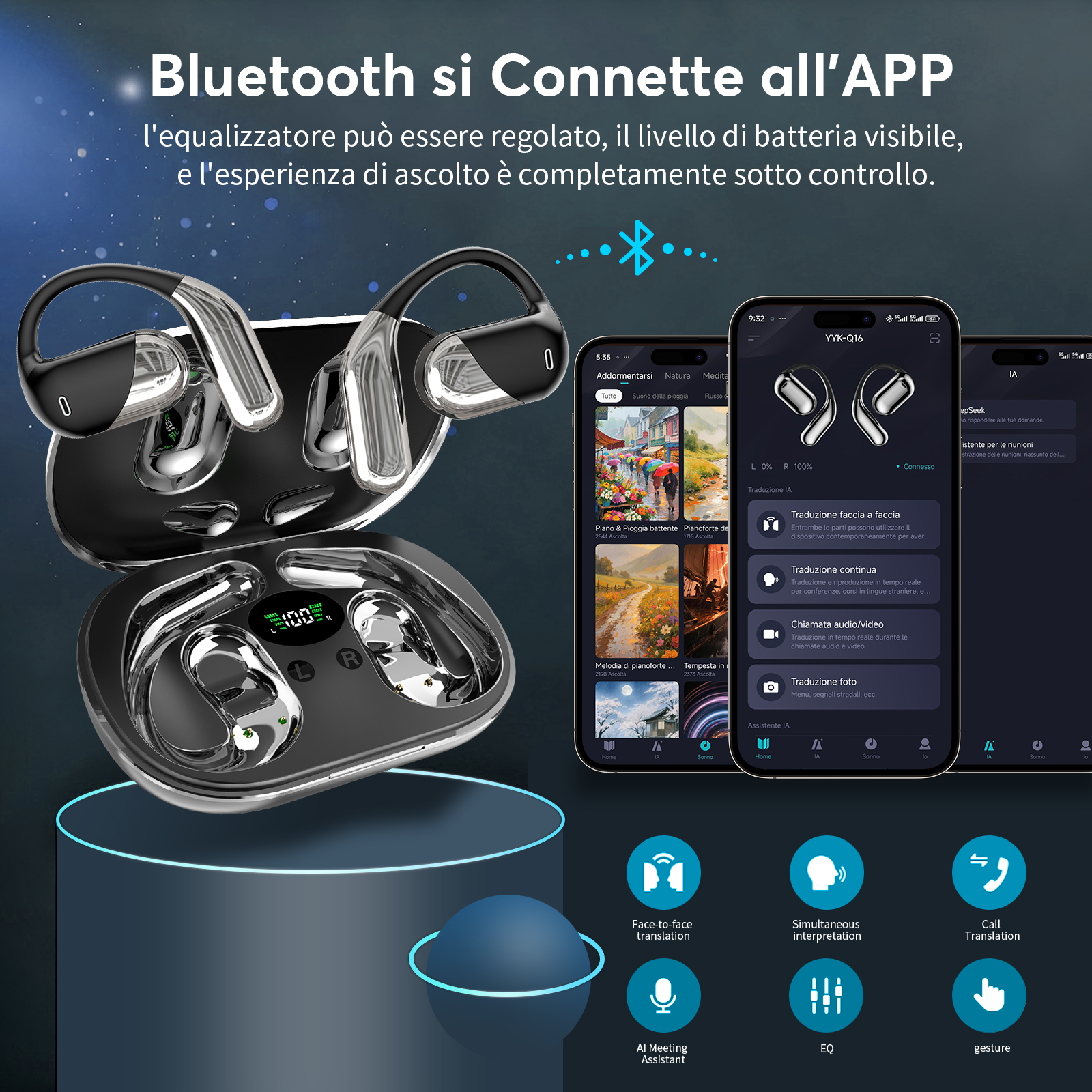 - [Funzionalità 3 in 1 e qualità audio HD] Combinando auricolari traduttori istantanei, riproduzione musicale e chiamate, questi auricolari sono perfetti per il lavoro e il tempo libero. Q16Pro AI H3 è dotato di un altoparlante a diaframma da 14,2 mm e 4 microfoni ad alta precisione per un’eccellente qualità del suono, offrendo musica e chiamate nitide in qualsiasi situazione.