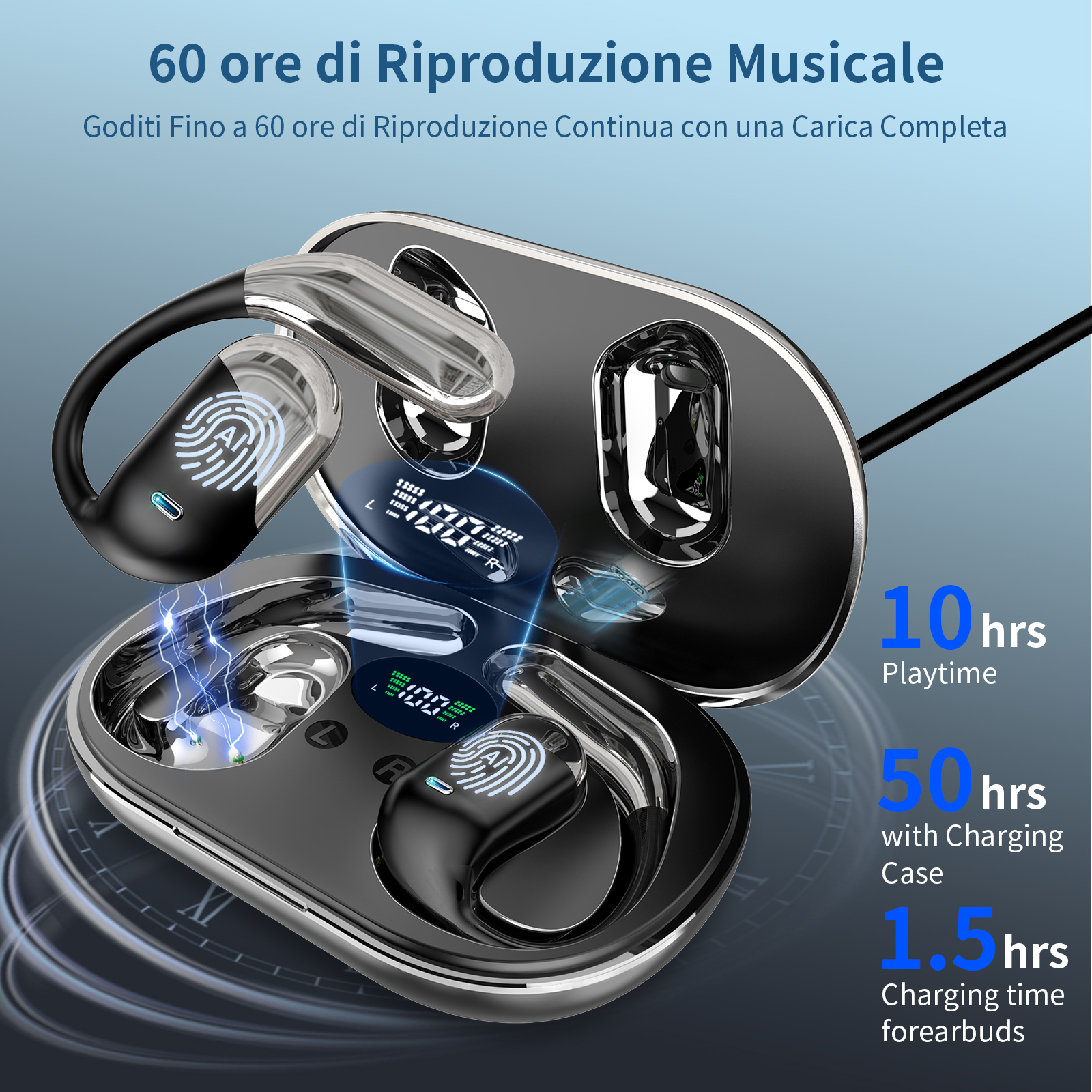 - [Connettività all’avanguardia con cuffie Bluetooth 6.1] Tuffati nel futuro con questi auricolari wireless open-ear dotati della tecnologia Bluetooth 6.1 all’avanguardia. Immergiti in velocità di trasferimento dati fulminee e una connessione stabile fino a 10 metri. Goditi un audio impeccabile e a bassa latenza dal momento in cui li togli dalla custodia, grazie all’ingegnosa funzione di accensione e connessione automatica.