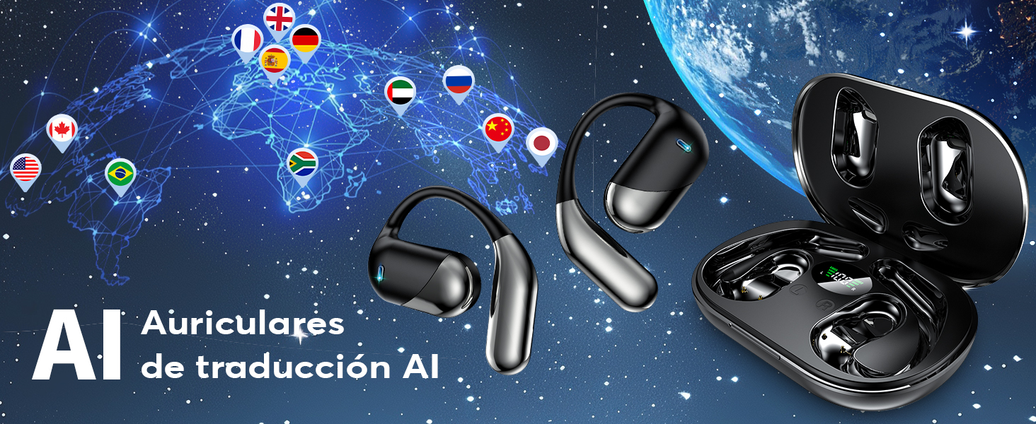 Auriculares Traductor en Tiempo Real con IA 3 en 1, Traductor Instantáneo de Voz para 198 Idiomas y Acentos (Español Inglés), Cascos Bluetooth Abiertos con Estuche de Carg Obsidiana