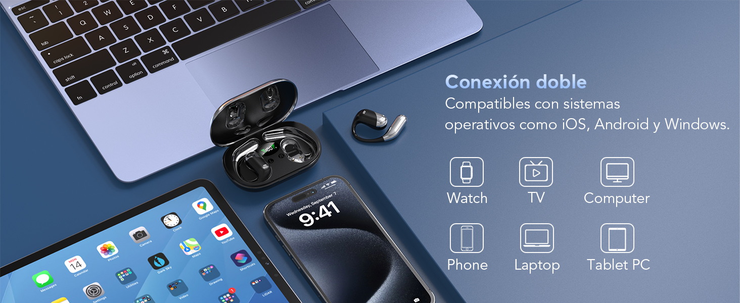 - [Conectividad Avanzada con Bluetooth 6.1] Sumérgete en el futuro con estos auriculares inalámbricos open-ear equipados con tecnología Bluetooth 6.1. Disfruta de velocidades de transferencia ultrarrápidas y una conexión estable de hasta 10 metros (33 pies). El audio sin latencia comienza automáticamente al sacarlos del estuche, gracias a la función de encendido y conexión automática.